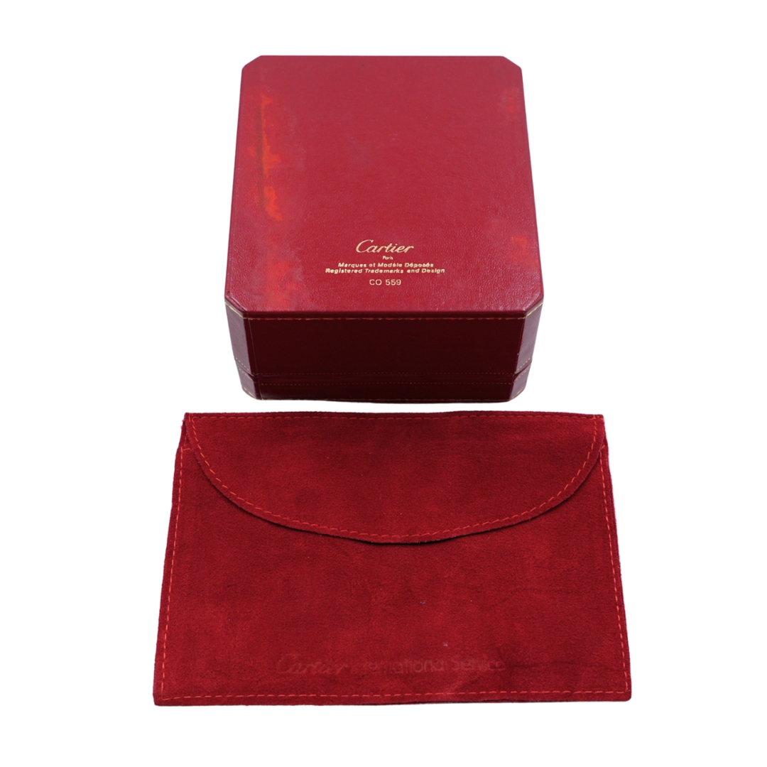 Its compact yet striking form makes it ideal for display on a desk, bedside, or mantel, adding an instant touch of prestige to any setting. The clock also includes its original red suede Cartier pouch, offering both protection and authenticity. A fine collectable and a wonderful gift, this Must de Cartier desk clock stands as a shining example of enduring elegance and impeccable taste