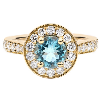 A brand-new, unused, certified 18ct yellow gold natural diamond & aquamarine gemstone round-shaped cluster ring, set with one round-cut aquamarine gemstone at the centre & a cluster of brilliant-cut diamonds in a halo setting & to the shoulders.