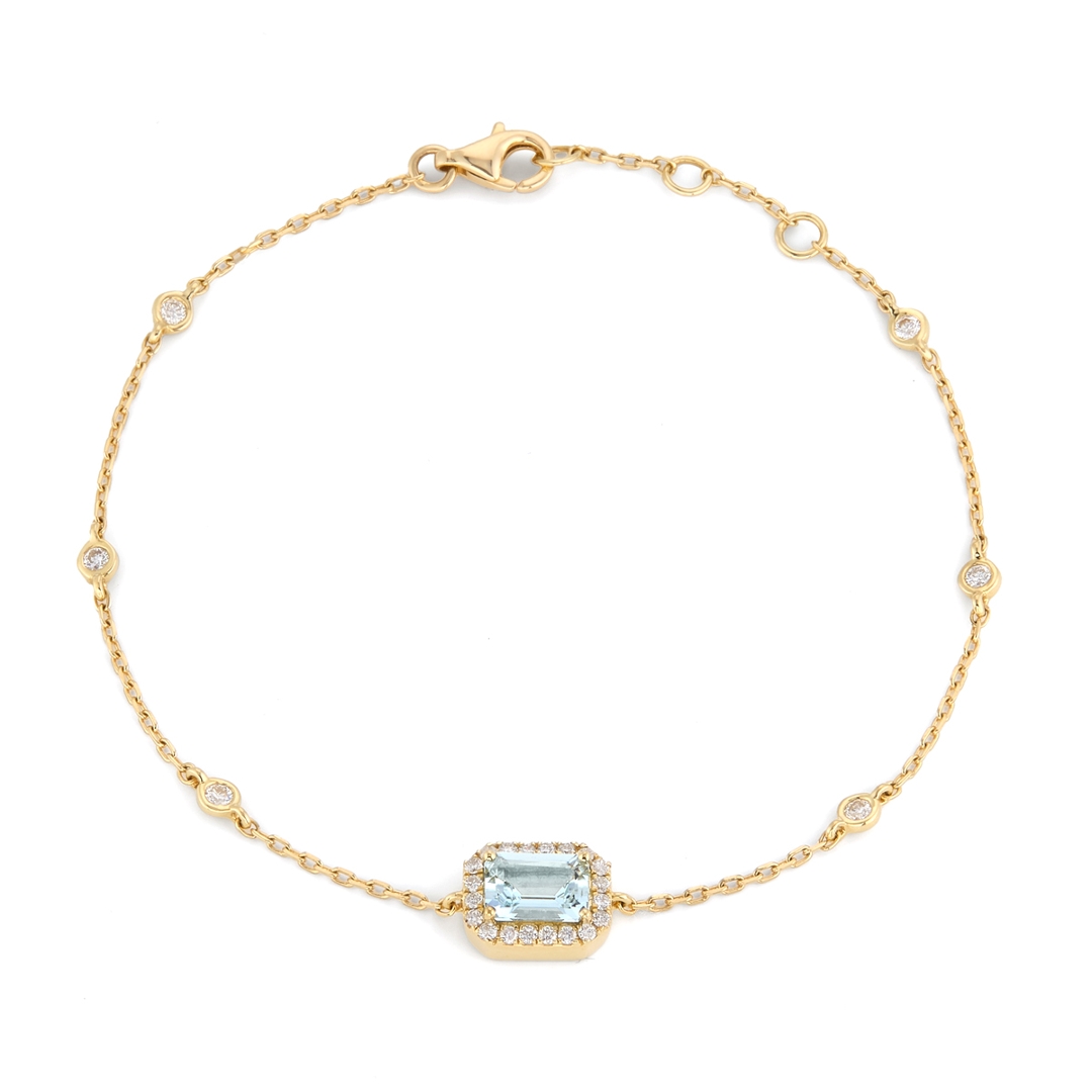 A brand-new, unused, certified natural diamond & aquamarine chain bracelet, set with one octagonal step cut aquamarine gemstone & a cluster of brilliant-cut diamonds, set in 18ct yellow gold.
