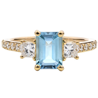 A brand-new, unused, certified 18ct yellow gold natural diamond & aquamarine gemstone three-stone cluster ring, set with one emerald-cut aquamarine gemstone at the centre, two princess-cut diamonds to the sides & a cluster of brilliant-cut diamonds to the shoulders.