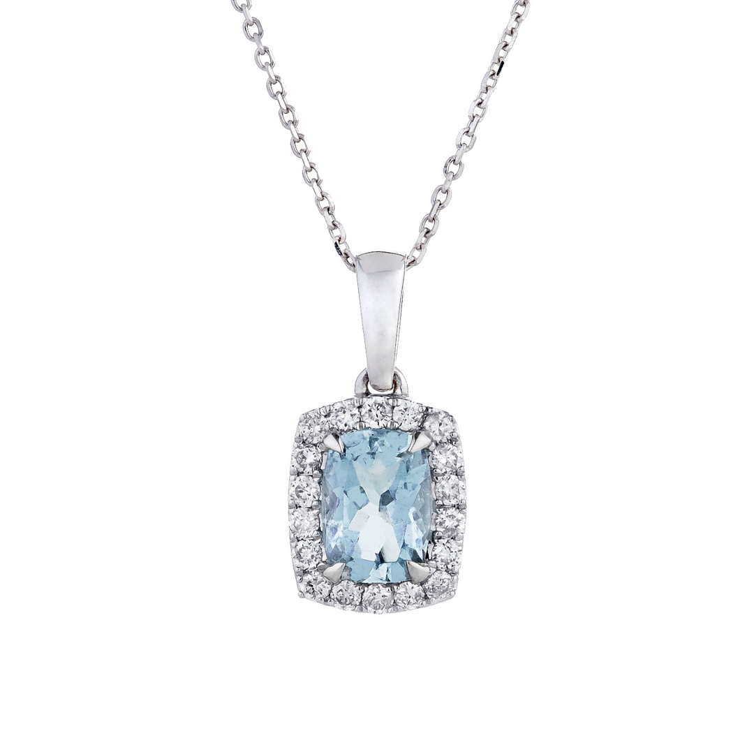 A brand-new, unused, certified natural diamond & aquamarine cushion-shaped cluster pendant, with one cushion mixed-cut aquamarine gemstone at the centre & a cluster of brilliant-cut diamonds in a halo setting, in 9ct white gold.