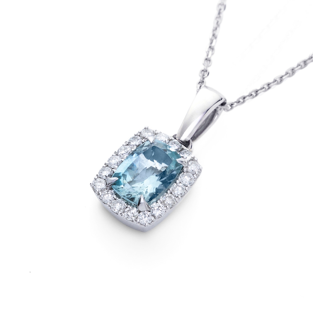 - > Natural Aquamarine 0.78ct & Diamond 0.19ct Cushion Shaped Cluster Pendant