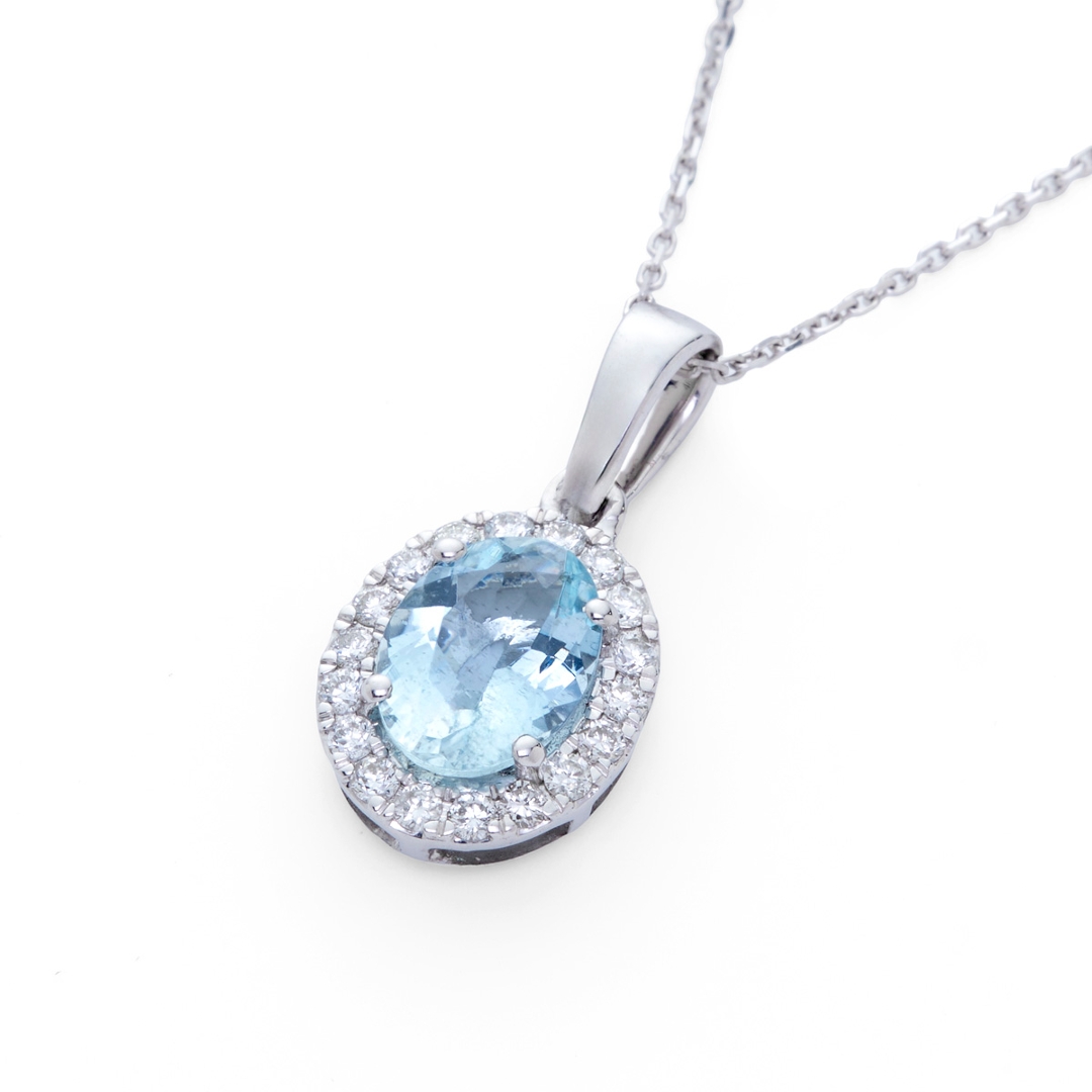 A brand-new, unused, certified natural diamond & aquamarine oval-shaped cluster pendant, with one oval mixed-cut aquamarine gemstone at the centre & a cluster of brilliant-cut diamonds in a halo setting, in 9ct white gold.