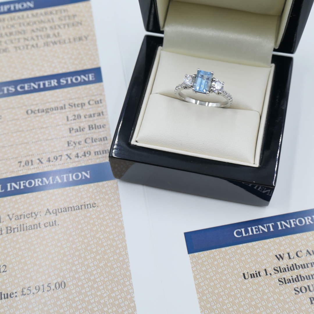 Accompanied by a professional valuation of £5,915, this certified aquamarine and diamond three-stone ring represents a perfect union of beauty and lasting value. With natural diamonds admired for their enduring investment appeal and aquamarine’s timeless charm, this piece stands as a luxurious and meaningful treasure.