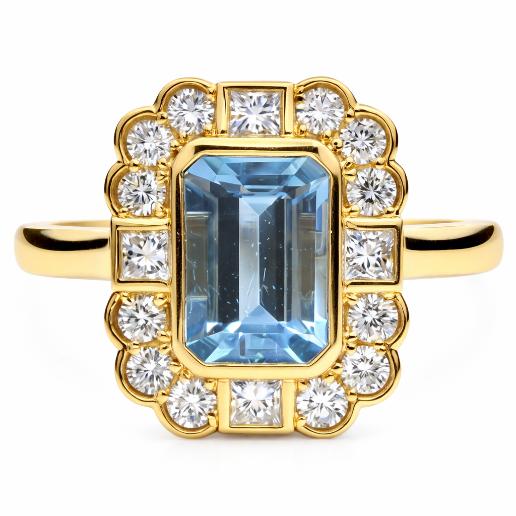 A brand-new, unused certified natural diamond and aquamarine flower-shaped cluster ring, crafted in 18ct yellow gold and designed to highlight crisp geometry with luminous colour. At its centre sits a beautifully proportioned 1.28ct emerald-cut aquamarine, displaying clean step-cut facets and a fresh, tranquil blue tone. Encircling the centre stone is an intricate halo composed of princess-cut and brilliant-cut natural diamonds, arranged to form a striking floral silhouette. With a combined diamond weight of 0.52ct, the setting delivers impressive sparkle, while the warmth of the yellow gold provides an elegant contrast to the cool brilliance of the stones.