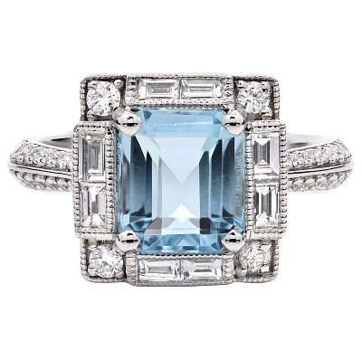 Surrounding the aquamarine are eight baguette-cut and four brilliant-cut certified natural diamonds arranged in a precise halo, combining linear definition with vibrant sparkle. A further cluster of brilliant-cut diamonds extends onto the shoulders, adding dimension and light from every angle. With a total diamond weight of 0.63ct, the natural diamonds deliver impressive fire and contrast against the serene blue centre, their billion-year formation underscoring their rarity and authenticity.