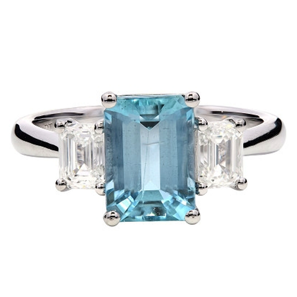 A brand-new, unused, certified natural diamond & aquamarine three-stone cluster ring, with one emerald-cut aquamarine gemstone at the centre & two emerald-cut diamonds to the sides, set in platinum.