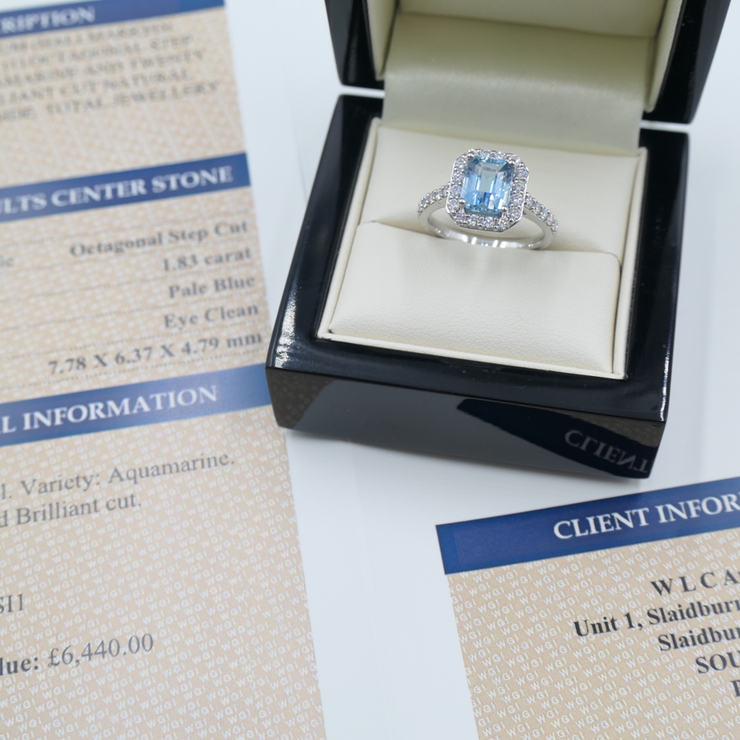 A brand-new, unused certified natural diamond and aquamarine cluster ring that embodies timeless sophistication and luxurious craftsmanship. At its centre lies a captivating 1.83-carat octagonal step-cut aquamarine, displaying a serene pale-blue hue with enchanting clarity and brilliance. Encircling the central gemstone is a halo of brilliant-cut natural diamonds that continue elegantly along the shoulders, creating a dazzling frame of light and sparkle. The diamonds, totalling 0.69 carats, are graded F–G in colour and VS2–SI1 in clarity, adding exceptional radiance that enhances the aquamarine’s soft, cool tone.