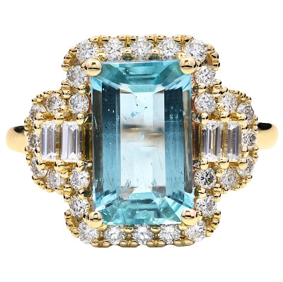 Flanking the aquamarine are four baguette-cut certified natural diamonds, creating clean architectural lines, while a surrounding halo of brilliant-cut natural diamonds adds depth and consistent sparkle. The diamonds have a combined weight of 0.60 carats and are carefully arranged to frame the centre stone without distraction. Set in warm 18ct yellow gold, the ring benefits from a metal prized for its longevity, richness, and enduring desirability, creating a harmonious contrast with both the aquamarine and diamonds.