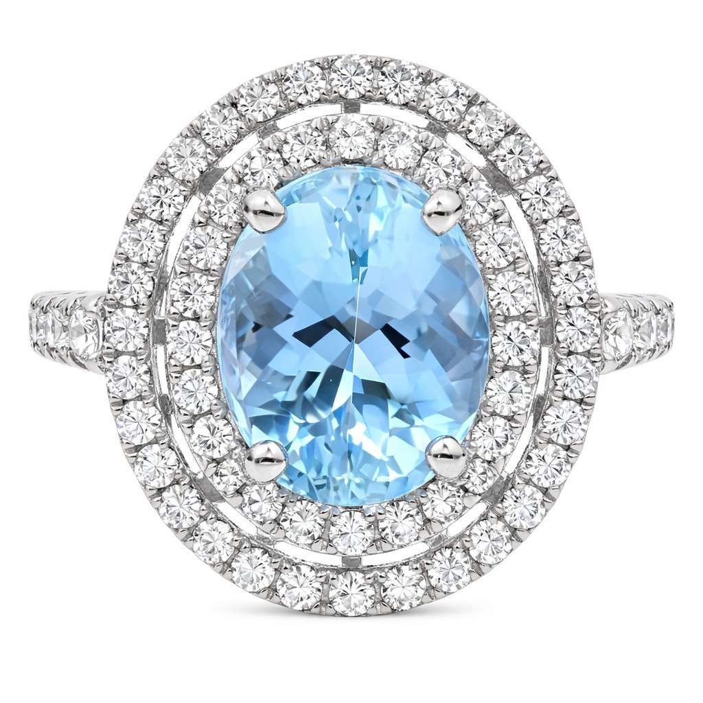 A brand-new, unused, certified natural diamond & aquamarine oval-shaped cluster ring, with one oval-cut aquamarine gemstone at the centre & a cluster of brilliant-cut diamonds in a double halo setting & to the shoulders, set in platinum.