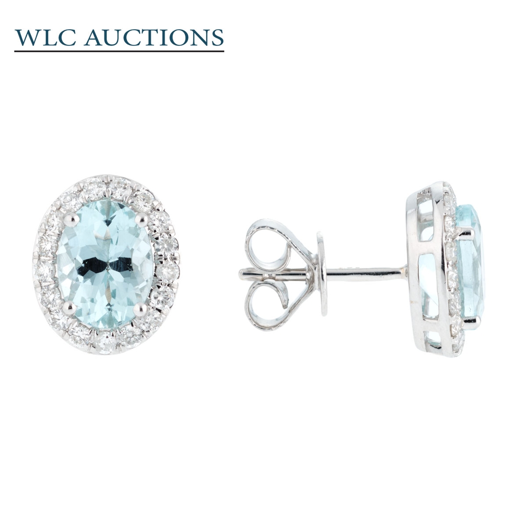 A brand-new, unused and certified pair of natural diamond and aquamarine cluster earrings, each designed in an elegant oval form, set with a central oval mixed-cut aquamarine and surrounded by a halo of brilliant-cut natural diamonds. The pale blue tone of the aquamarine offers a clean, refreshing appearance, perfectly complemented by the bright finish of the 18ct white gold setting, creating a refined, timeless look.