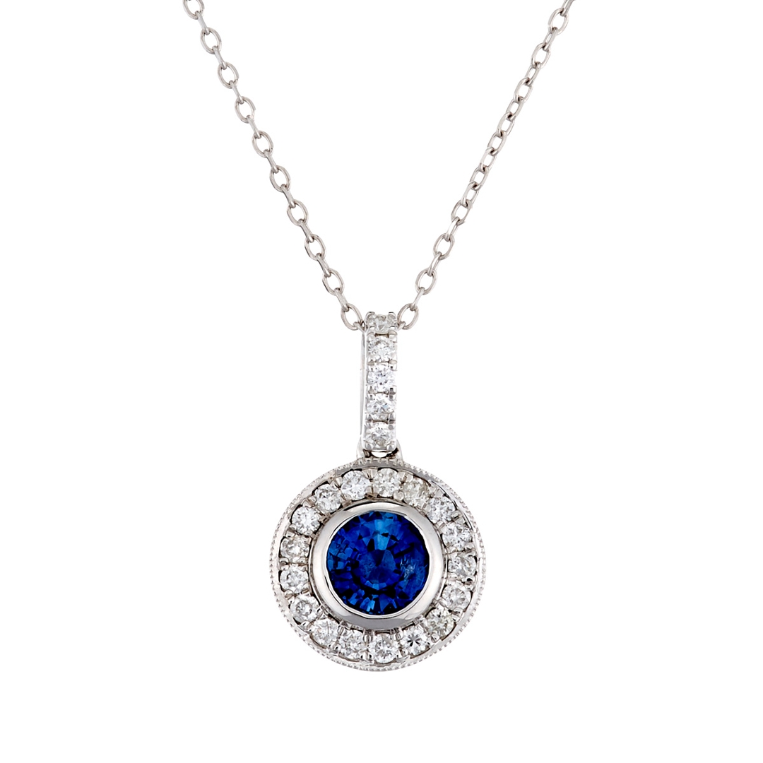 A brand-new, unused, certified natural diamond & blue sapphire gemstone round-shaped cluster pendant, with one round mixed-cut blue sapphire gemstone & a cluster of brilliant-cut diamonds, set in 18ct white gold.