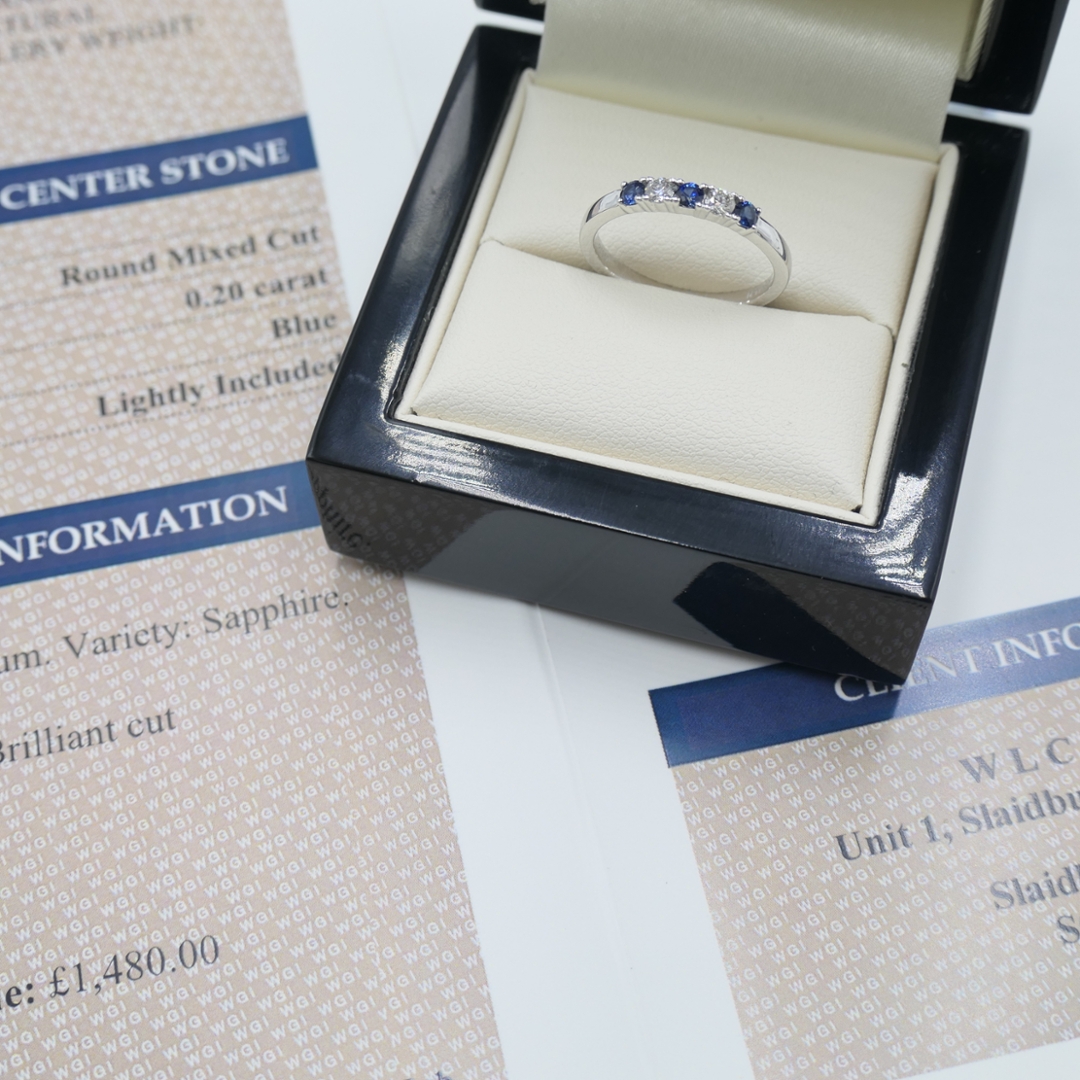 A brand new, unused, certified platinum natural diamond & blue sapphire gemstone eternity ring, set with three round mixed cut blue sapphire gemstones & two brilliant cut diamonds.