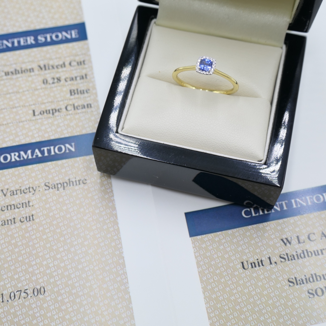 A brand-new, unused, certified 18ct yellow gold natural diamond and blue sapphire gemstone cushion-shaped cluster ring. At the heart of this stunning piece lies a cushion-cut blue sapphire weighing 0.28 carats, radiating a rich, captivating blue hue. Surrounding the sapphire is a halo of brilliant-cut diamonds, totalling 0.03 carats, which add a brilliant sparkle to the design. The diamonds, with a clarity of SI1-SI2 and a G-H colour grade, enhance the overall elegance of the ring.