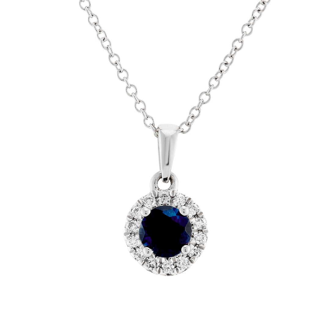 A brand new, unused certified natural diamond & blue sapphire gemstone round-shaped cluster pendant, with one round mixed cut blue sapphire gemstone to the centre & a cluster of brilliant cut diamonds in a halo setting, set in 18ct white gold.