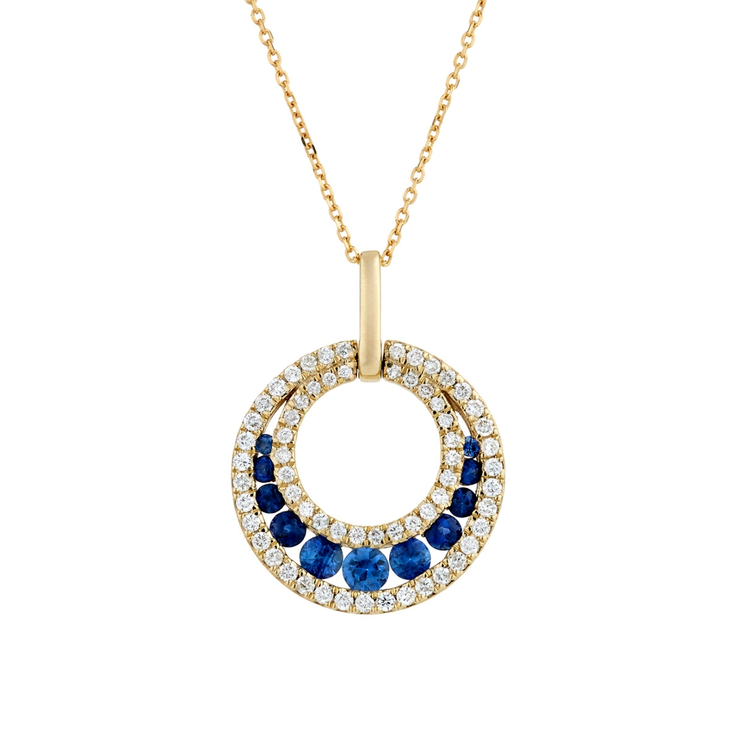 A brand-new, unused, certified natural diamond & blue sapphire circle-shaped cluster pendant, with a cluster of round mixed-cut blue sapphire gemstones at the centre & a cluster of brilliant-cut diamonds in a halo setting, in 9ct yellow gold.