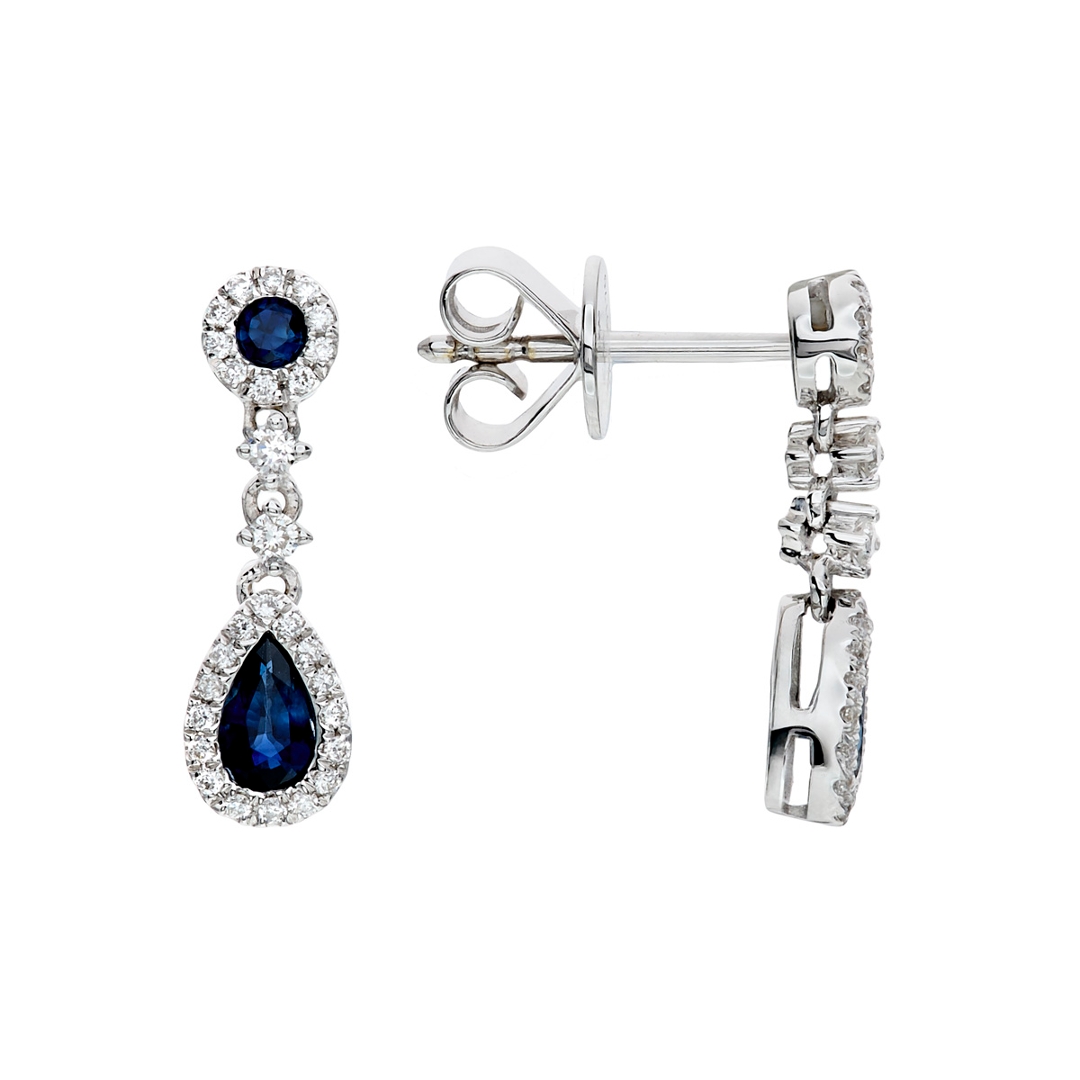 A brand-new, unused certified pair of natural diamond and blue sapphire gemstone cluster earrings, exquisitely crafted in 18ct white gold. Each earring features a delicate combination of two round mixed-cut and two pear mixed-cut blue sapphires, together weighing 0.52 carats, displaying a captivating deep blue hue that symbolises sophistication and elegance. Surrounding the sapphires is a refined cluster of brilliant-cut natural diamonds, totalling 0.19 carats, with F-G colour and VS2–SI1 clarity. The cool white gold setting enhances both the sapphires' intensity and the diamonds' crisp sparkle, creating a graceful droplet design that radiates timeless beauty.