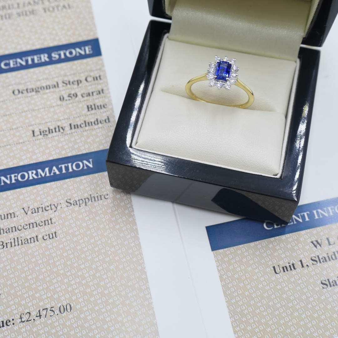 A brand-new, unused, certified 18ct yellow and white gold natural diamond and blue sapphire gemstone cluster ring. At its heart is a 0.59ct octagonal step-cut blue sapphire, which exudes a deep, rich blue hue that draws the eye. Surrounding the sapphire is a halo of brilliant-cut diamonds, with a total weight of 0.31ct. These diamonds, graded SI1-SI2 for clarity and G-H for colour, offer exceptional sparkle that enhances the sapphire's striking beauty. With a weight of 2.69 grams.