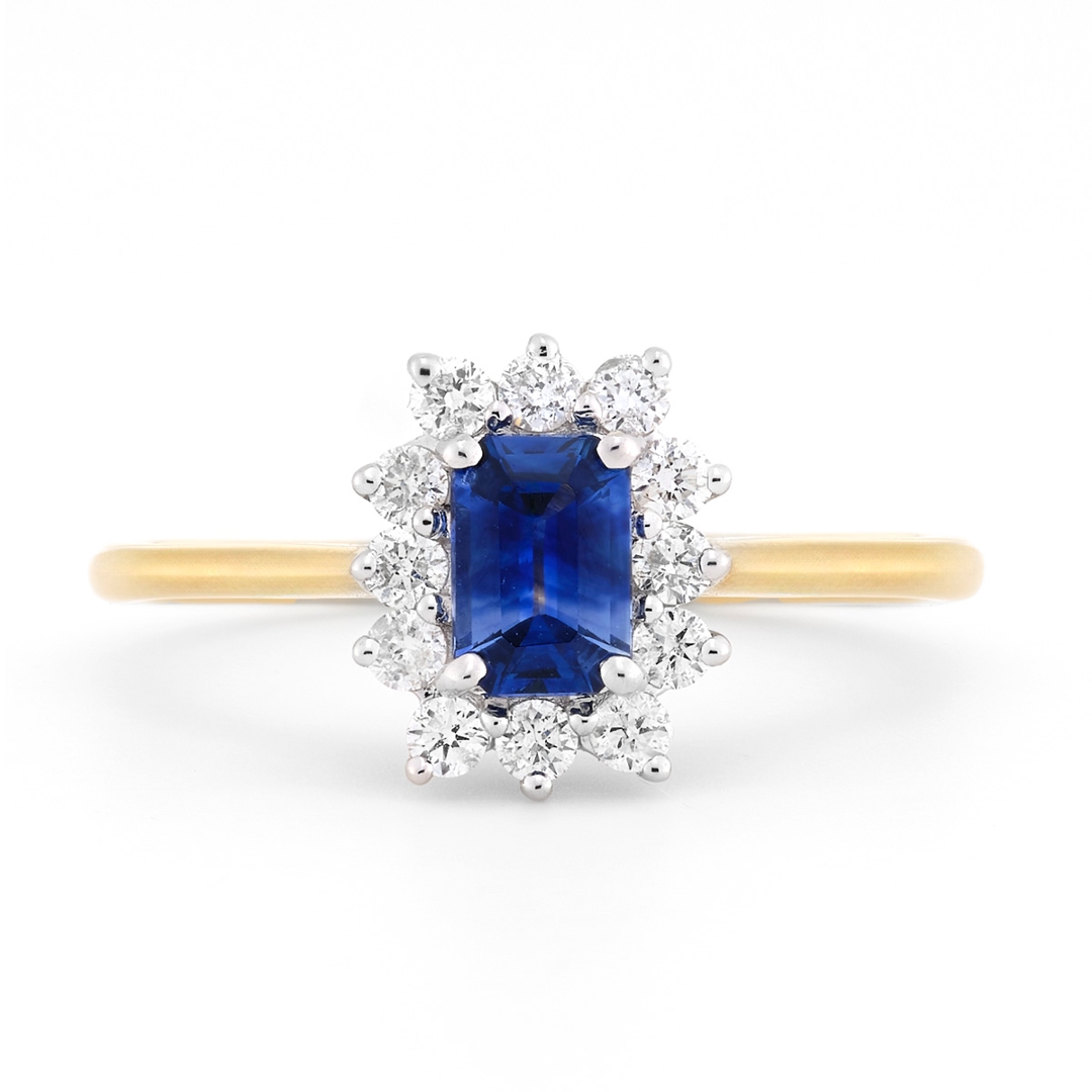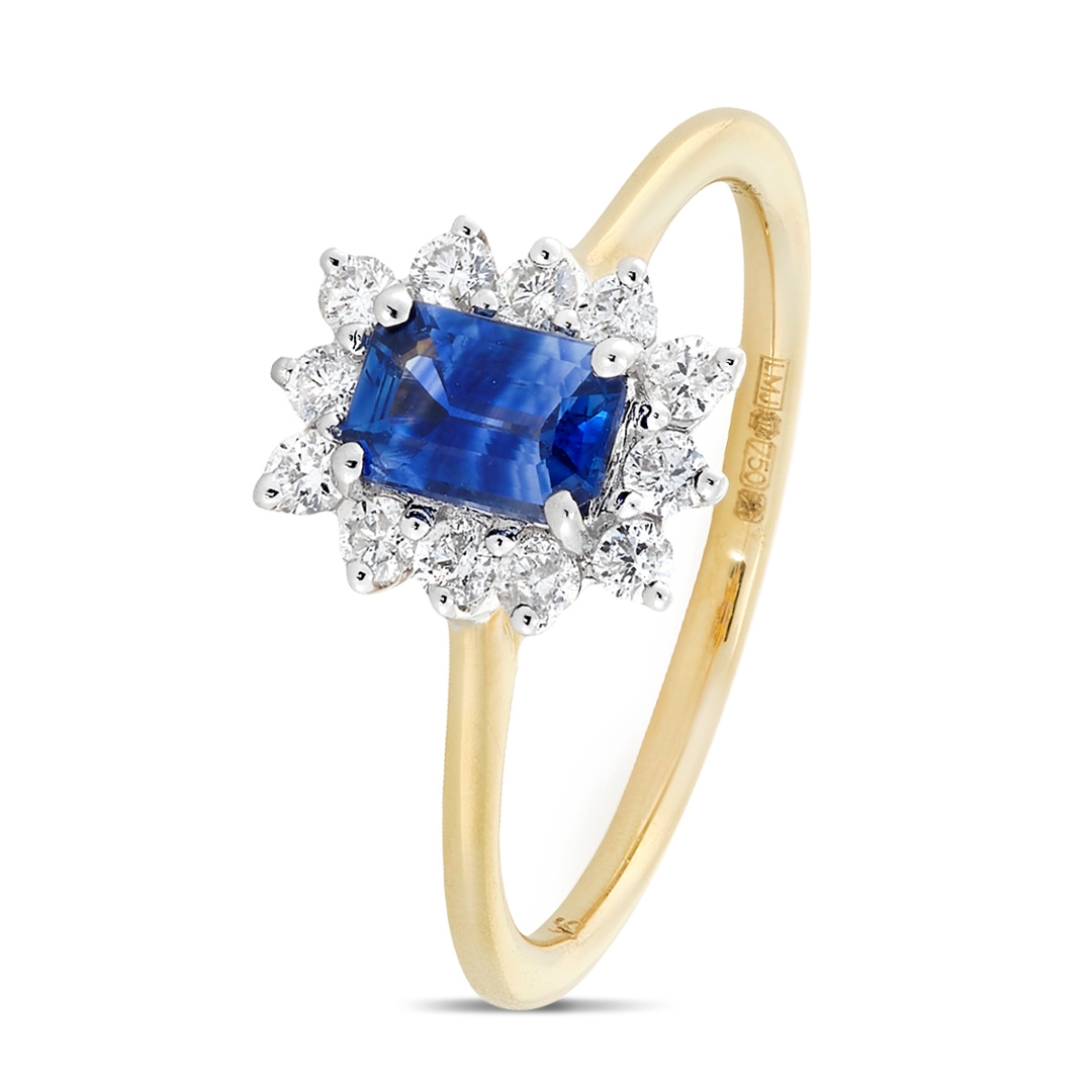 A brand new, unused, certified natural diamond & blue sapphire gemstone cluster ring, set with one octagonal step-cut blue sapphire gemstone to the centre & a cluster of brilliant cut diamonds in a halo setting, set in 18ct yellow & white gold.