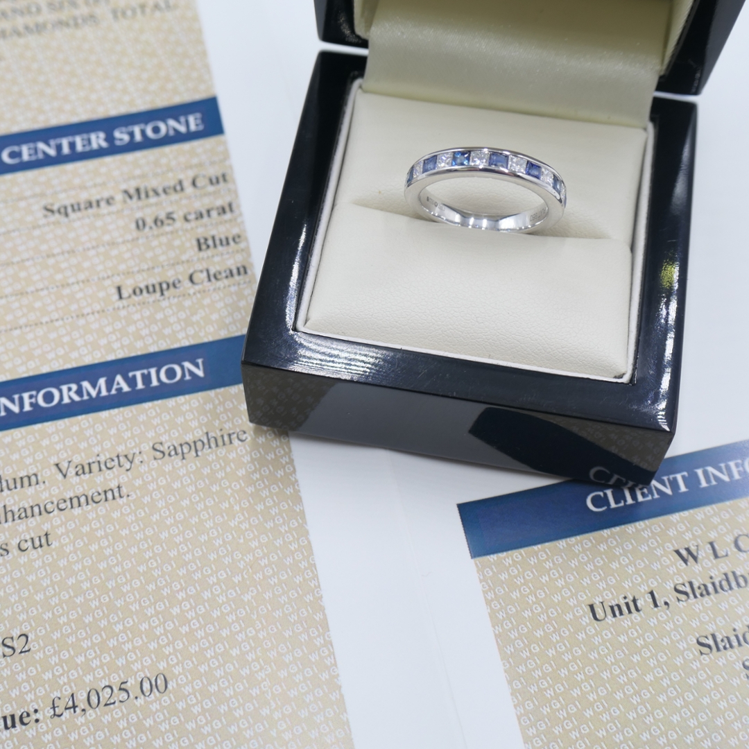 A brand new, unused, certified natural diamond & blue sapphire gemstone eternity ring, set with seven square mixed cut blue sapphire gemstones & six princess cut diamonds, set in platinum.