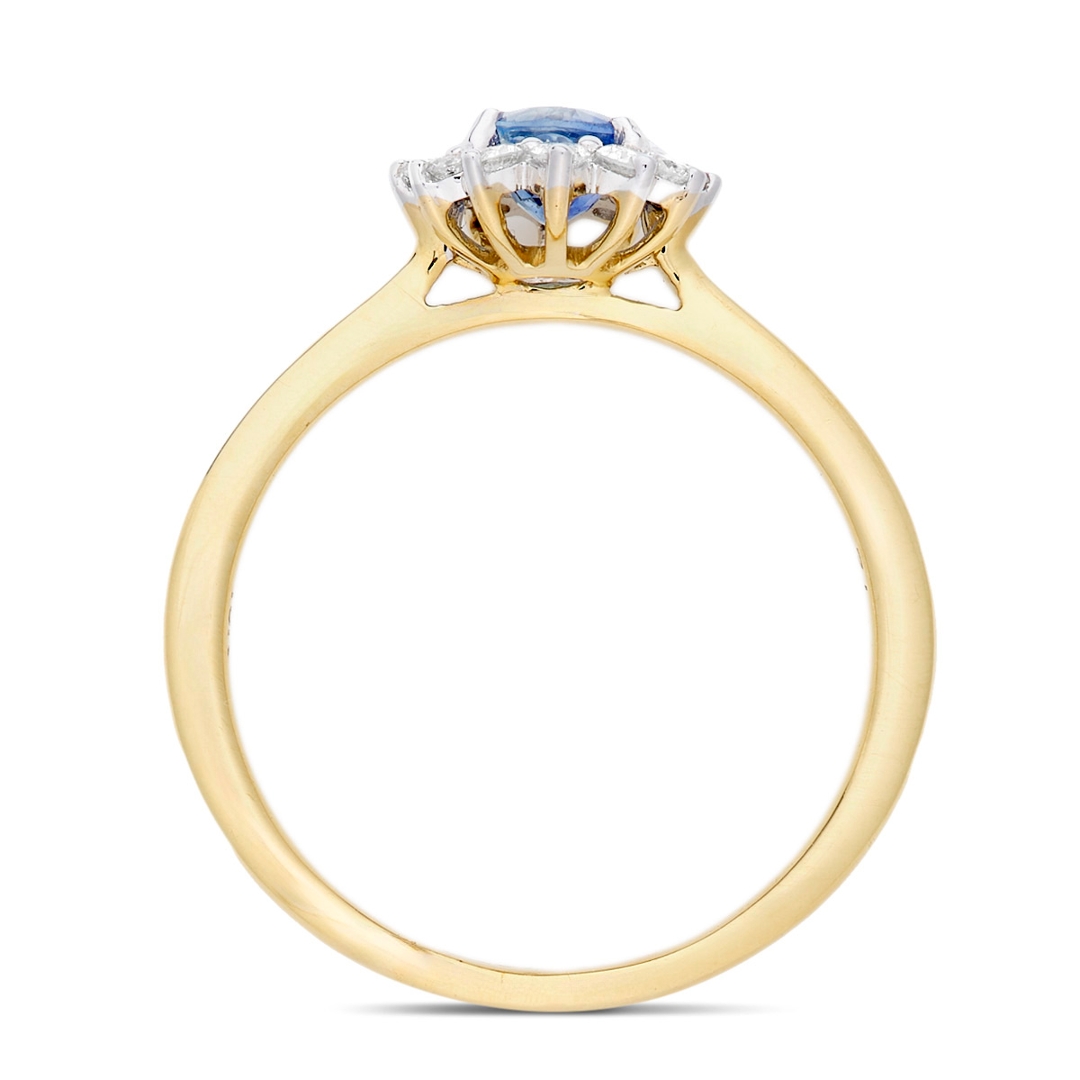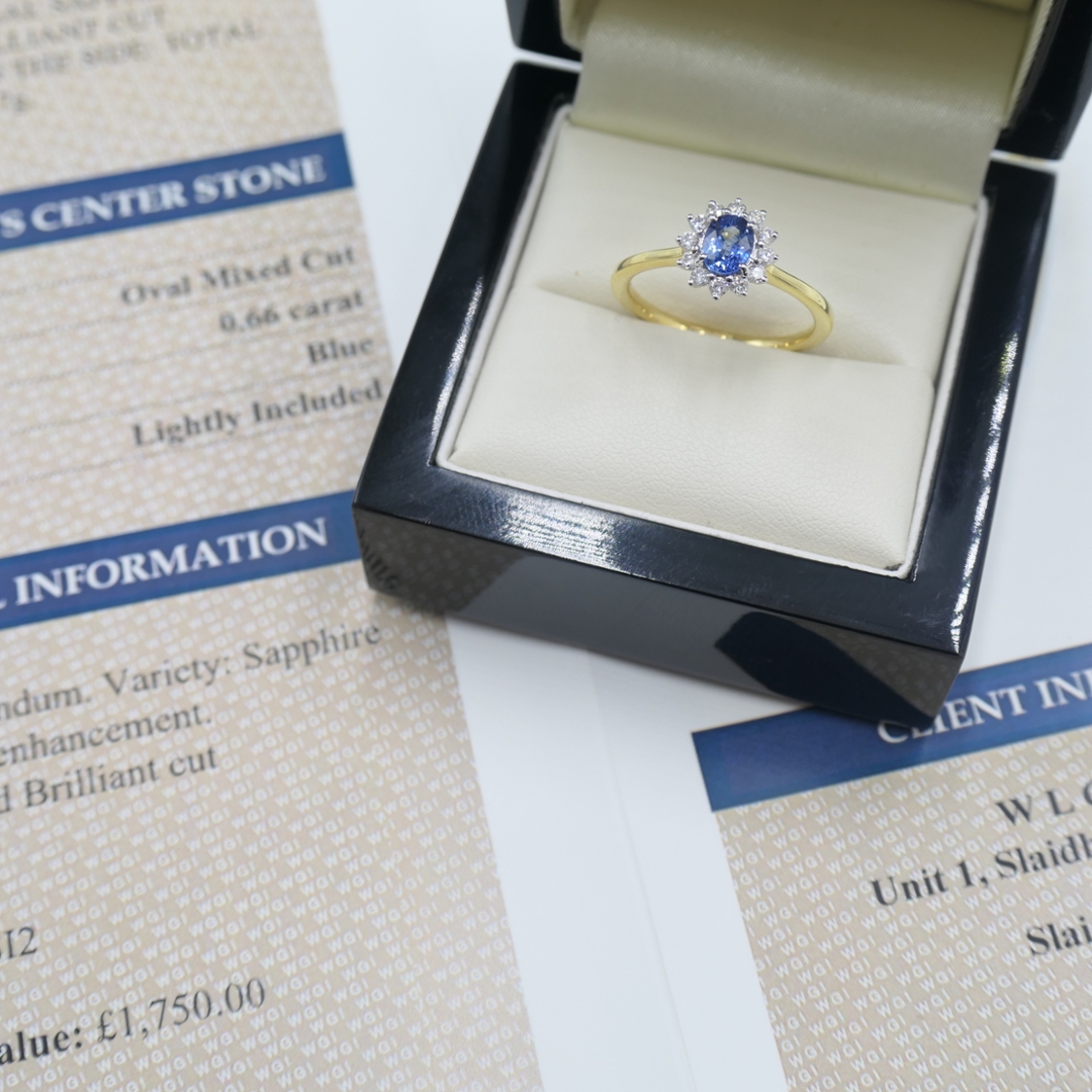 A brand-new, unused certified 18ct yellow and white gold ring, this beautiful cluster design combines the elegance of natural diamonds with the striking beauty of a blue sapphire. At the centre, an oval mixed-cut blue sapphire weighing 0.66ct displays a deep, captivating blue hue that commands attention. Surrounding the sapphire is a halo of brilliant-cut diamonds, totalling 0.20ct. These diamonds, selected for their SI1-SI2 clarity and G-H colour, add a brilliant sparkle that perfectly enhances the vibrant blue of the sapphire.