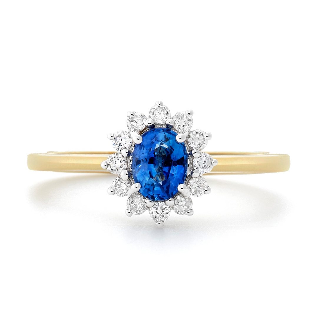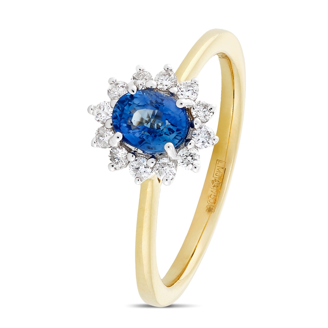 A brand new, unused, certified 18ct yellow & white gold natural diamond & blue sapphire gemstone cluster ring, set with one oval mixed cut blue sapphire gemstone to the centre & a cluster of brilliant cut diamonds in a halo setting.