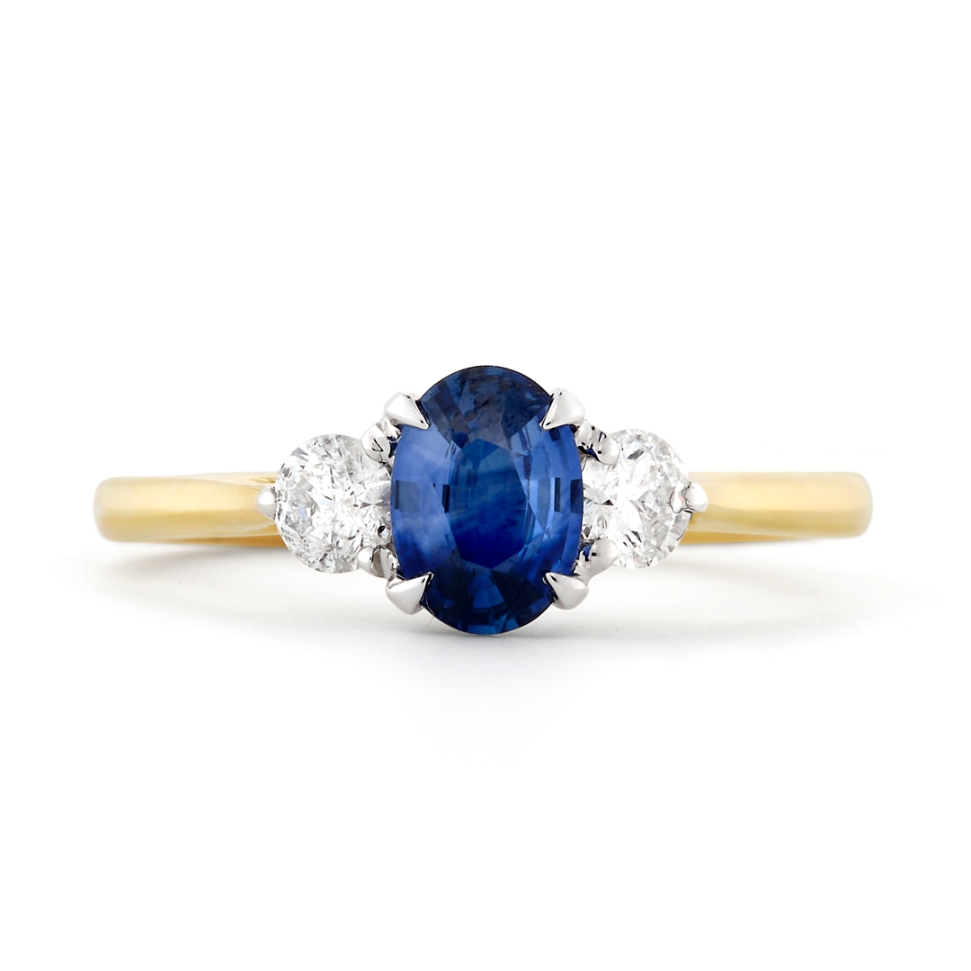 A brand-new, unused, certified natural diamond & blue sapphire gemstone three-stone cluster ring, set with one oval mixed-cut blue sapphire gemstone at the centre & two brilliant-cut diamonds to the sides, set in 18ct yellow & white gold.