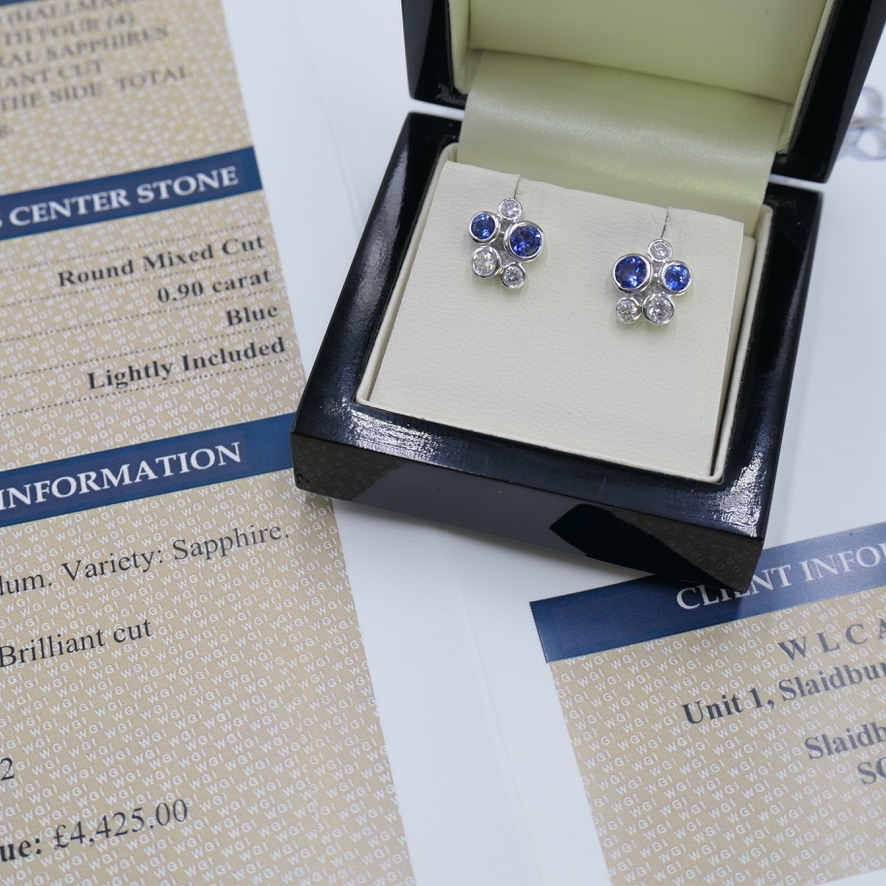 - > Natural Blue Sapphire 0.90ct & Diamond 0.38ct Cluster Earrings
