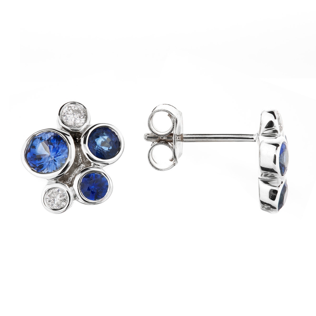 A brand new, unused, certified pair of natural diamond & blue sapphire gemstone cluster earrings, set with four round mixed cut blue sapphire gemstones & six brilliant cut diamonds, set in 18ct white gold.