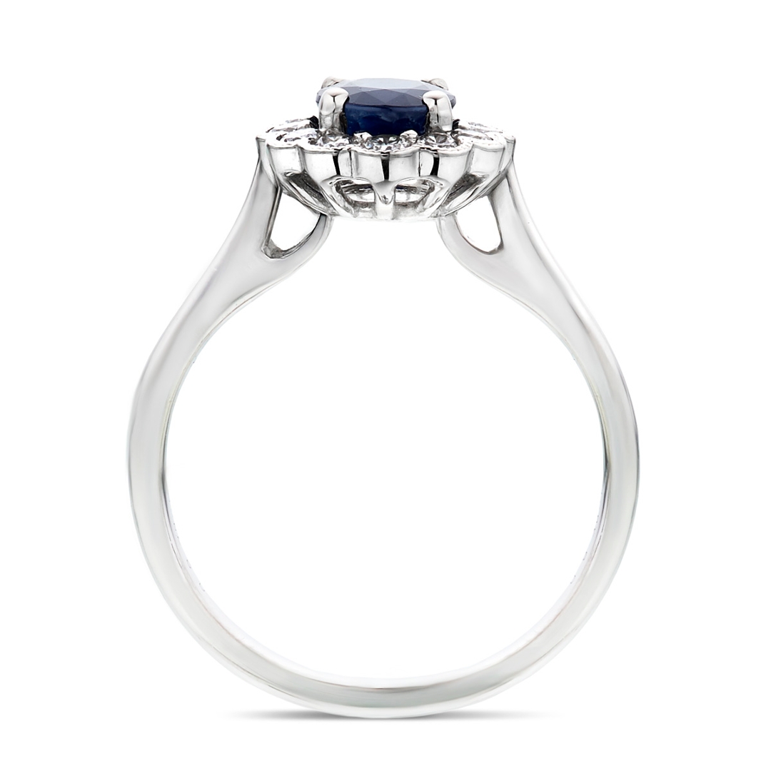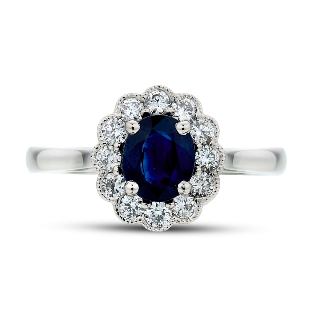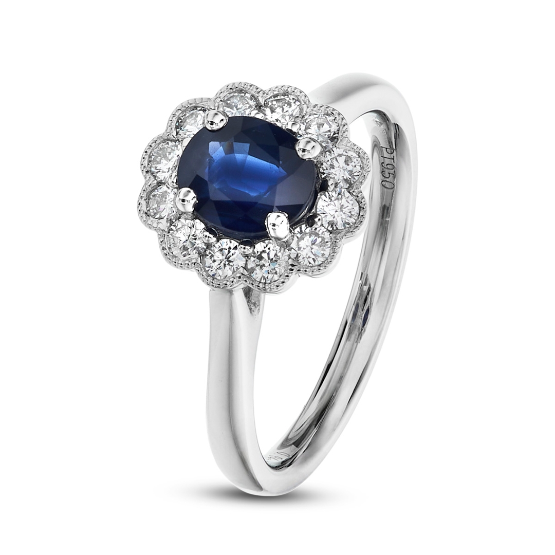 A brand-new, unused, certified natural diamond & blue sapphire gemstone flower-shaped cluster ring, with one oval mixed-cut blue sapphire gemstone to the centre & a cluster of brilliant cut diamonds in a halo setting, set in platinum