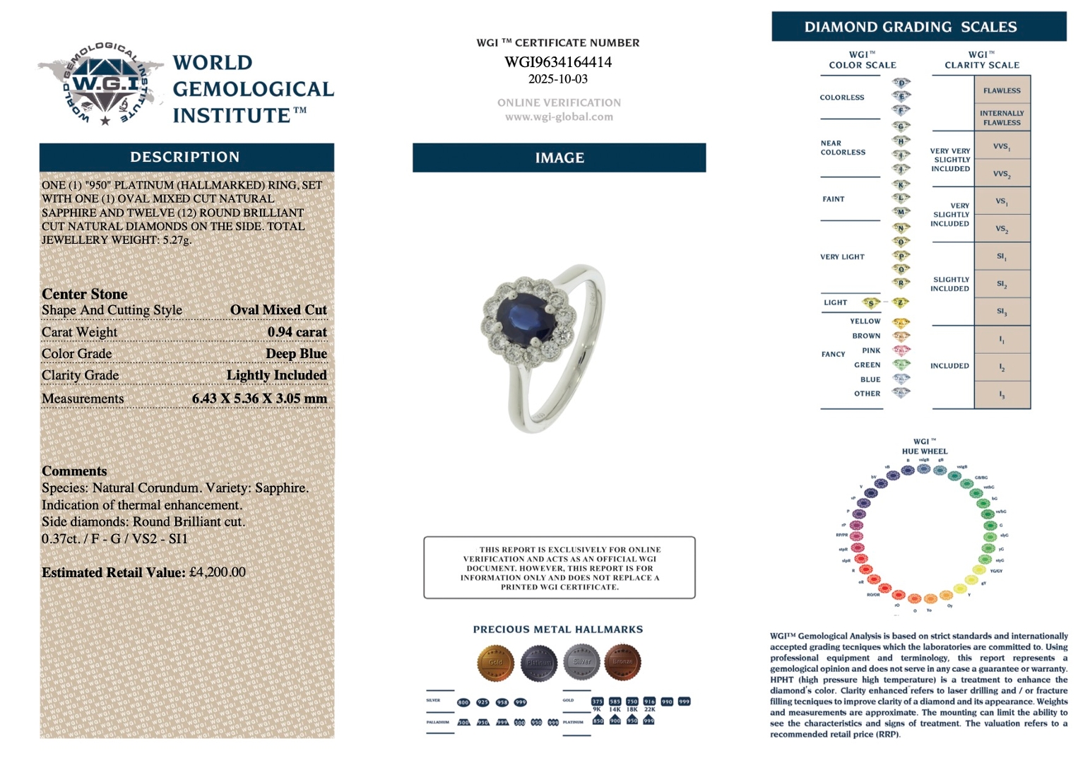 A brand-new, unused, certified natural diamond and blue sapphire gemstone cluster ring, beautifully crafted in platinum. At its heart lies a striking oval mixed-cut blue sapphire weighing 0.94 carats, displaying a captivating deep blue hue that evokes sophistication and timeless elegance. Surrounding the sapphire is a radiant halo of brilliant-cut natural diamonds, totalling 0.37 carats, with exceptional F-G colour and VS2–SI1 clarity. The luminous platinum setting enhances the contrast between the velvety sapphire and the crisp, pure brilliance of the diamonds, creating a refined, floral-inspired design that exudes both grace and prestige.