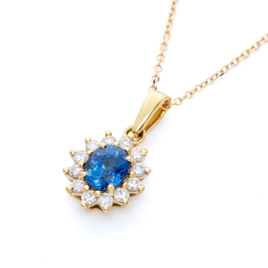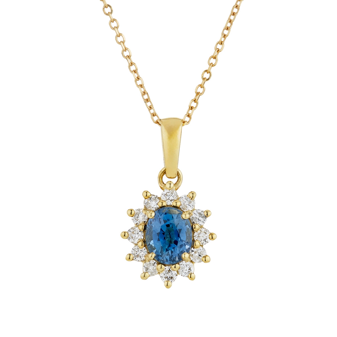 A brand-new, unused, certified natural diamond & blue sapphire cluster pendant, with one variety mixed-cut blue sapphire gemstone at the centre & twelve brilliant-cut diamonds in a halo setting, in 18ct yellow gold.