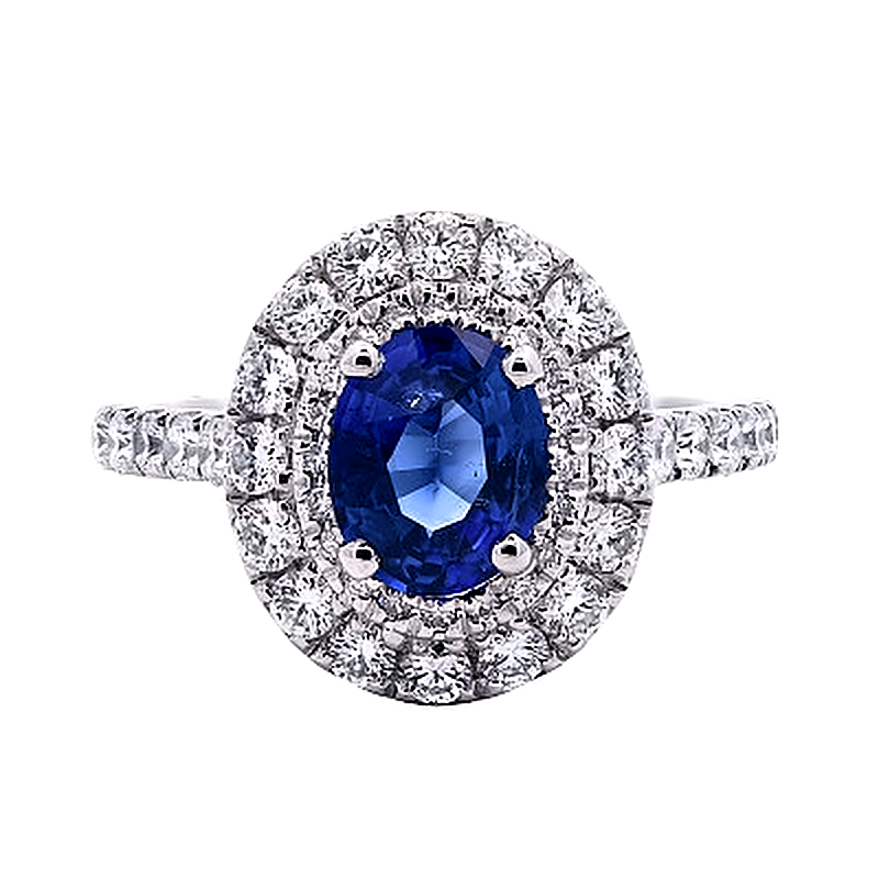 A brand-new, unused, certified natural diamond and blue sapphire oval-shaped cluster ring, designed to command attention with refined brilliance and rich colour. At its centre sits a 0.99ct oval-cut blue sapphire, displaying deep, velvety tones and impressive clarity. The elegant oval is framed by a striking double halo of brilliant-cut natural diamonds, carefully arranged to enhance the sapphire’s presence and create a bold, dimensional outline.