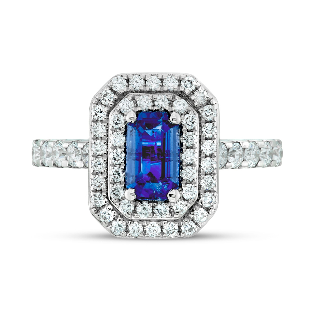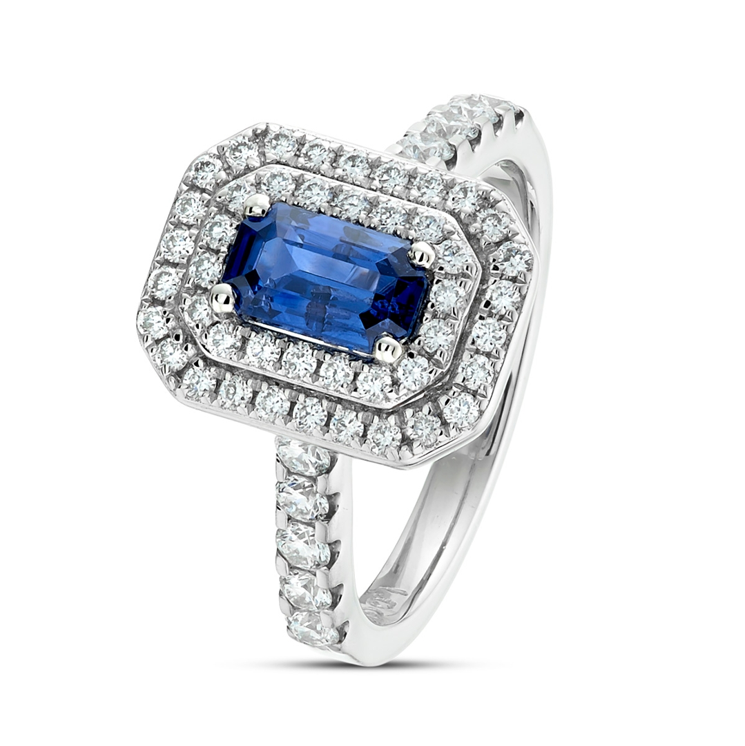 A brand-new, unused, certified natural diamond & blue sapphire emerald-shaped cluster ring, with one octagonal step-cut blue sapphire gemstone to the centre & a cluster of brilliant-cut diamonds in a double halo setting & to the shoulders, set in platinum.