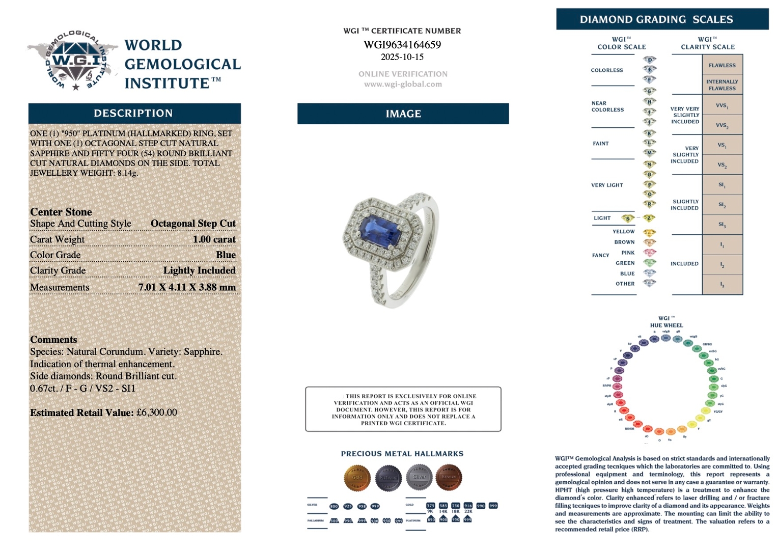 A brand-new, unused certified natural diamond and blue sapphire cluster ring that embodies timeless elegance and exquisite craftsmanship. At its centre lies a 1.00-carat octagonal step-cut blue sapphire, displaying a rich, velvety hue with remarkable depth and clarity. Surrounding this striking gemstone is a magnificent double halo of brilliant-cut natural diamonds, which continue gracefully along the shoulders to create a spectacular play of light and fire. The diamonds, with a total weight of 0.67 carats, are graded F–G in colour and VS2–SI1 in clarity, offering exceptional sparkle that beautifully enhances the sapphire’s intense tone.