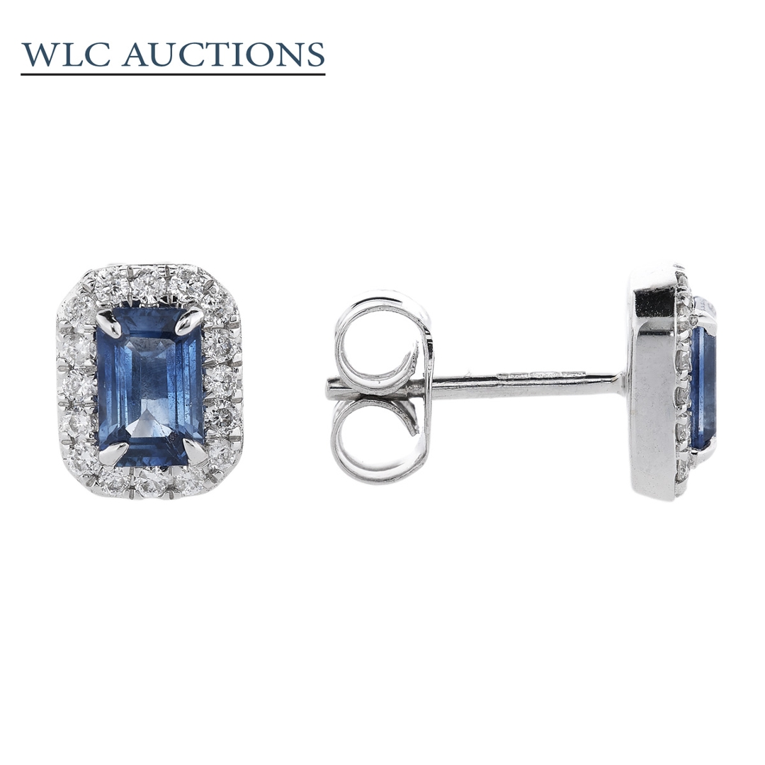 A brand-new, unused, certified pair of natural diamond & blue sapphire emerald-shaped cluster earrings, with two octagonal step-cut blue sapphire gemstones at the centre & a cluster of brilliant-cut diamonds in a halo setting, set in 18ct white gold.