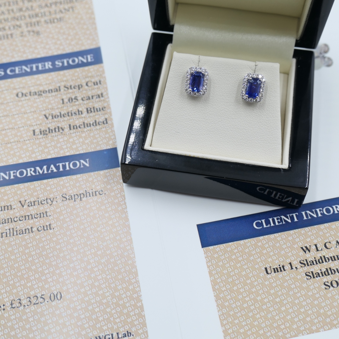 A brand-new, unused certified pair of natural diamond and blue sapphire gemstone cluster earrings, elegantly crafted in 18ct white gold. Each earring features a striking octagonal step-cut blue sapphire, weighing 1.05 carats and displaying a captivating violetish-blue hue that embodies timeless sophistication and royal allure. Surrounding each sapphire is a radiant cluster of brilliant-cut natural diamonds, totalling 0.32 carats, with G-H colour and SI1–SI2 clarity. Their crisp brilliance enhances the rich tone of the sapphires, while the sleek white gold setting adds a refined contemporary edge, allowing each gemstone to sparkle with exceptional clarity and depth.