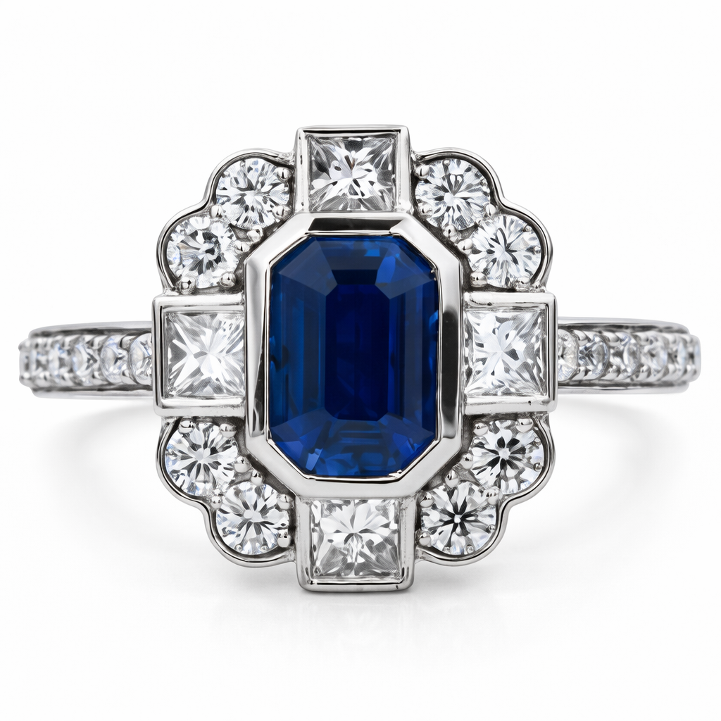 A brand-new, unused certified natural diamond and blue sapphire flower-shaped cluster ring, set with a captivating 1.15ct emerald-cut blue sapphire at its centre, encircled by a striking arrangement of four princess-cut and eight brilliant-cut diamonds, with additional brilliant-cut diamonds extending to the shoulders, all crafted in platinum. The structured geometry of the centre stones combined with the floral-inspired cluster design creates a distinctive and eye-catching balance of precision and elegance.