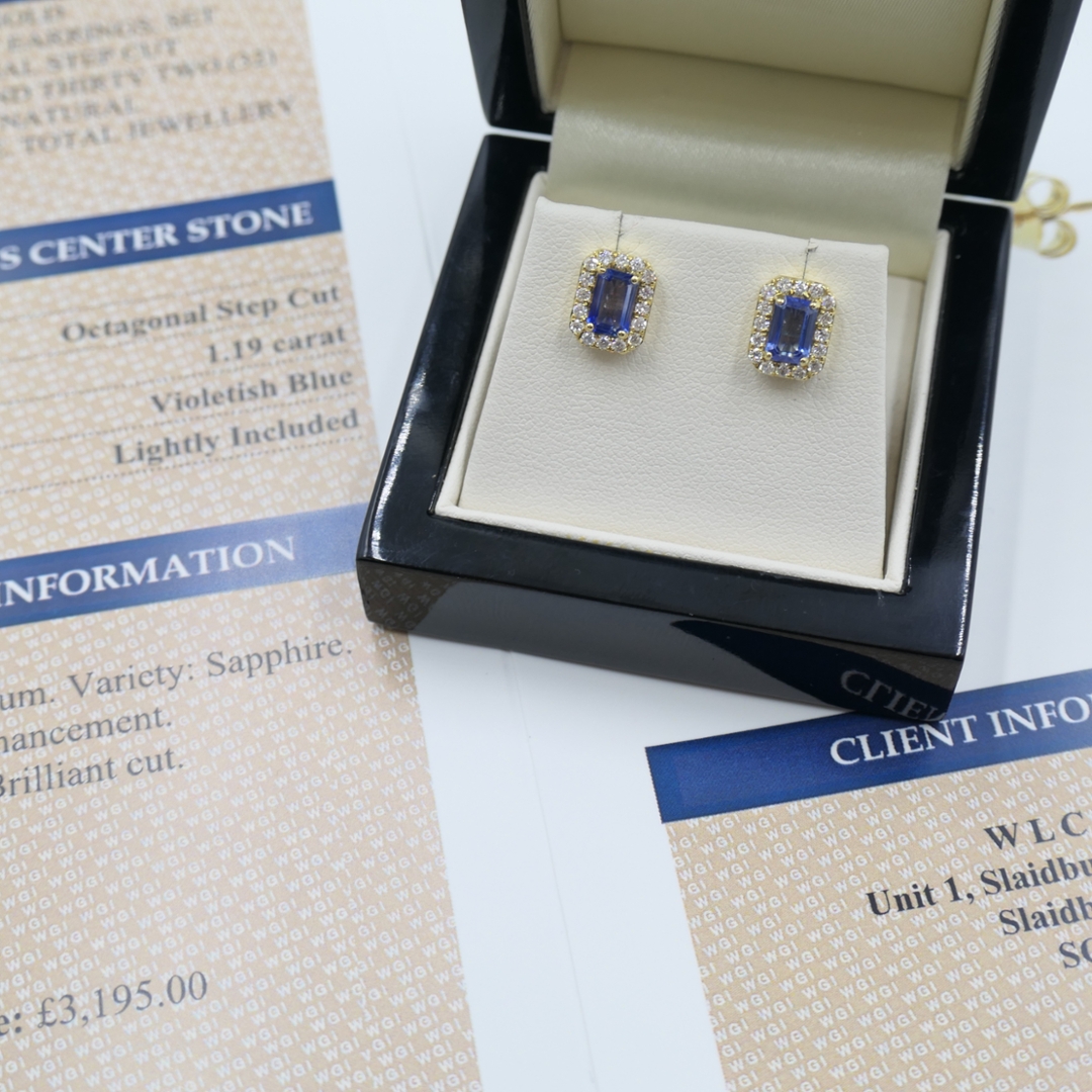 A brand-new, unused certified pair of natural diamond and blue sapphire gemstone cluster earrings, exquisitely crafted in 18ct yellow gold. Each earring features a striking octagonal step-cut blue sapphire, weighing 1.05 carats and displaying a rich violetish-blue hue that radiates depth and refined elegance. Surrounding each sapphire is a cluster of brilliant-cut natural diamonds, totalling 0.33 carats, with G-H colour and SI1–SI2 clarity, offering a bright, crisp sparkle that enhances the sapphires’ deep tone. The warmth of the yellow gold setting provides a luxurious contrast, enriching both the diamonds' brilliance and the blue sapphires' velvety allure.