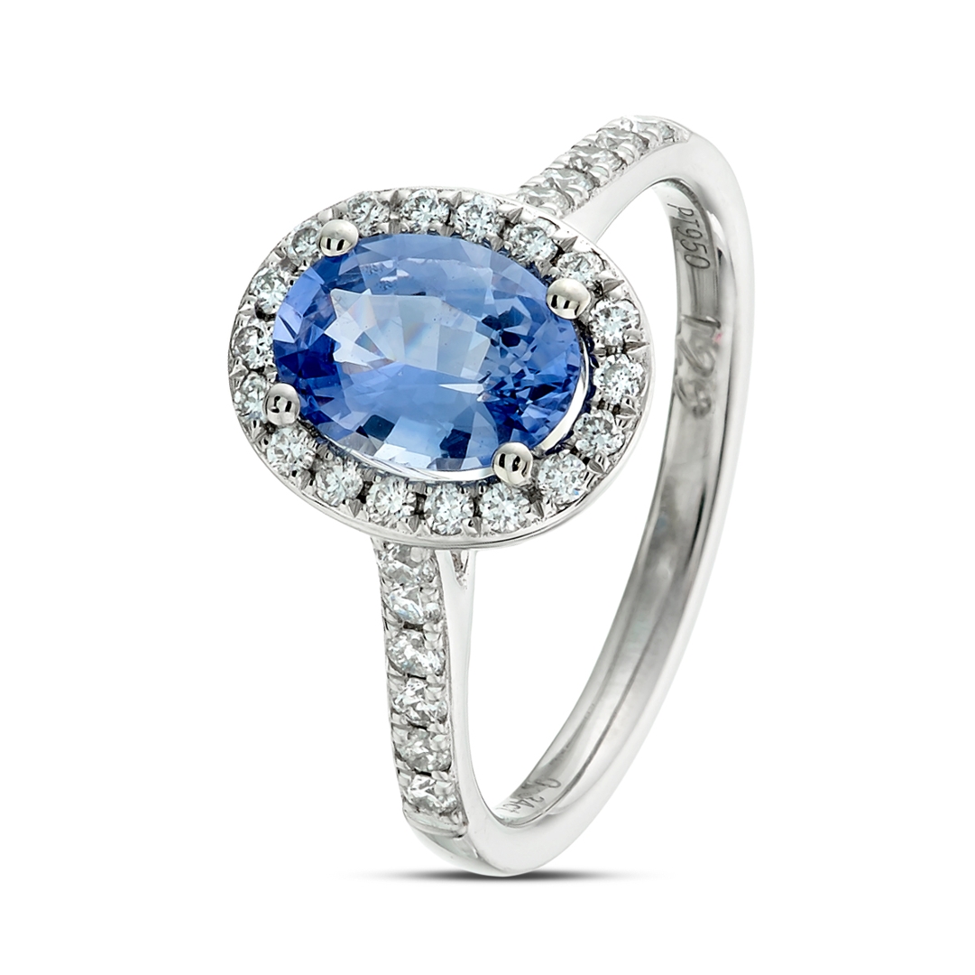 A brand-new, unused, certified natural diamond & blue sapphire oval-shaped cluster ring, with one oval mixed-cut blue sapphire gemstone to the centre & a cluster of brilliant-cut diamonds in a halo setting & to the shoulders, set in platinum.