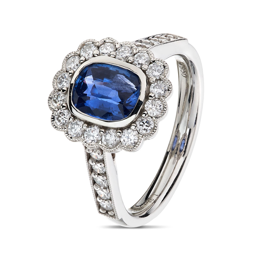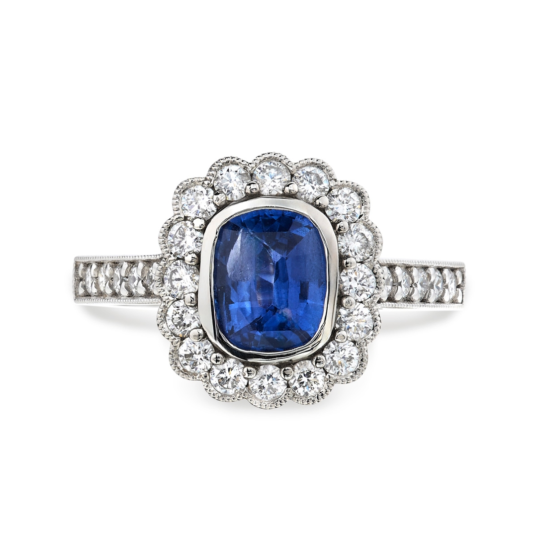 A brand-new, unused, certified natural diamond & blue sapphire gemstone flower-shaped cluster ring, with one cushion mixed-cut blue sapphire gemstone to the centre & a cluster of brilliant cut diamonds in a halo setting & to the shoulders, set in platinum