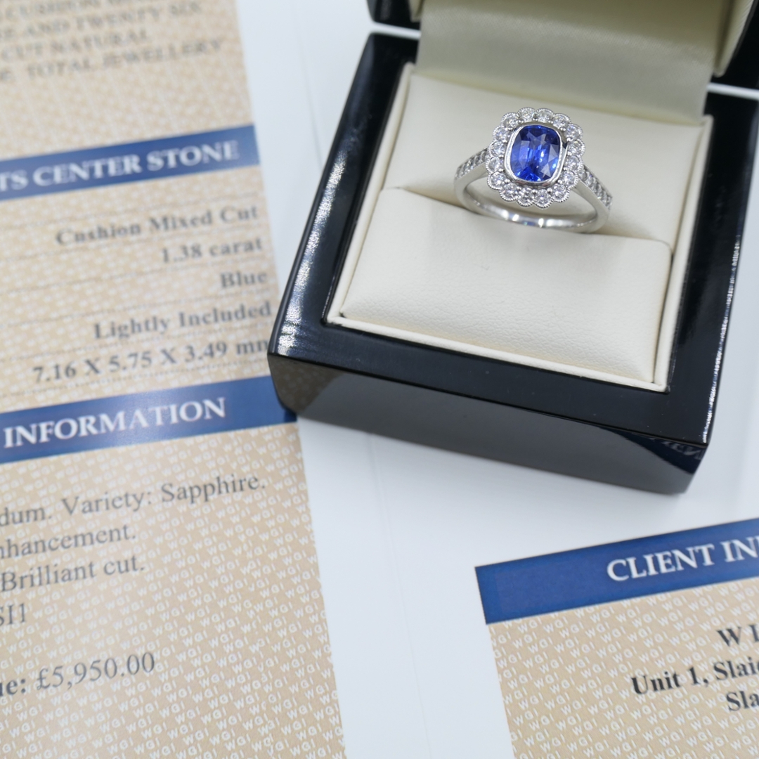 A brand-new, unused, certified natural diamond and blue sapphire gemstone cluster ring, beautifully crafted in platinum. At its centre is a captivating cushion-cut blue sapphire weighing 1.38 carats, displaying a deep, alluring blue hue that symbolises elegance and timeless sophistication. Surrounding the sapphire is a glittering halo of brilliant-cut natural diamonds, with additional diamonds adorning the shoulders, creating a luxurious and balanced design. The diamonds, totalling 0.69 carats with F-G colour and VS2–SI1 clarity, add a radiant brilliance that perfectly complements the sapphire’s velvety tone. The platinum setting enhances the gemstones’ purity and luminosity, resulting in a refined piece that embodies classic beauty and modern grace.