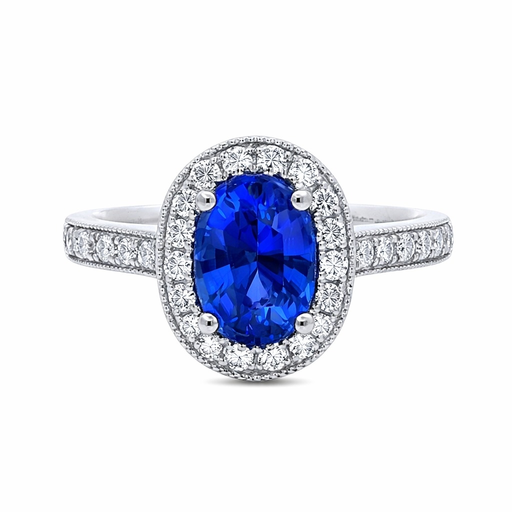 Surrounding the sapphire is a halo of brilliant-cut natural diamonds that continues elegantly along the shoulders to create a cohesive, well-balanced profile. With a total diamond weight of 0.35 carats, the diamonds add subtle brilliance and contrast, complementing rather than overpowering the centre stone. The platinum setting provides strength, longevity, and a clean contemporary finish, making the ring suitable for long-term wear while retaining its premium feel.