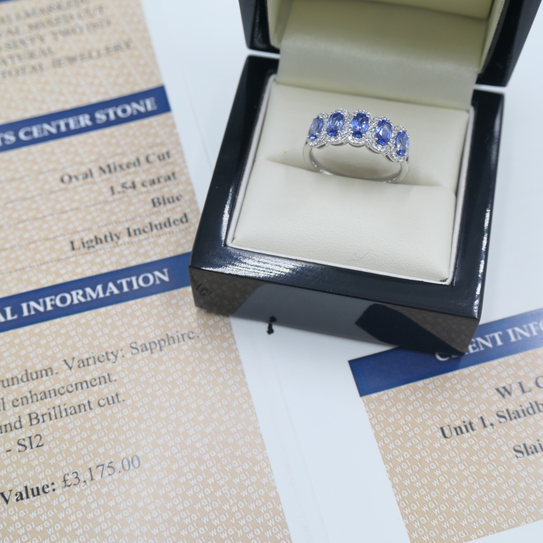 A brand-new, unused cluster ring crafted in certified platinum, this elegant design is set with five oval, mixed-cut natural blue sapphires weighing a total of 1.54 carats. Their rich blue tones are enhanced by a halo of natural brilliant-cut diamonds surrounding each sapphire, creating a continuous line of colour and sparkle across the band. The diamonds, with a combined weight of 0.35ct, are graded F–G in colour and SI1–SI2 in clarity, ensuring bright, lively brilliance that perfectly complements the sapphires. The cool sheen of platinum provides both strength and refinement, completing this timeless piece.
