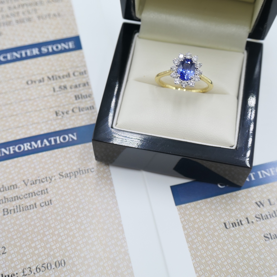A brand new, unused, certified natural diamond & blue sapphire gemstone cluster ring, set with one oval mixed cut blue sapphire gemstone to the centre & a cluster of brilliant cut diamonds in a halo setting, set. in 18ct yellow & white gold.