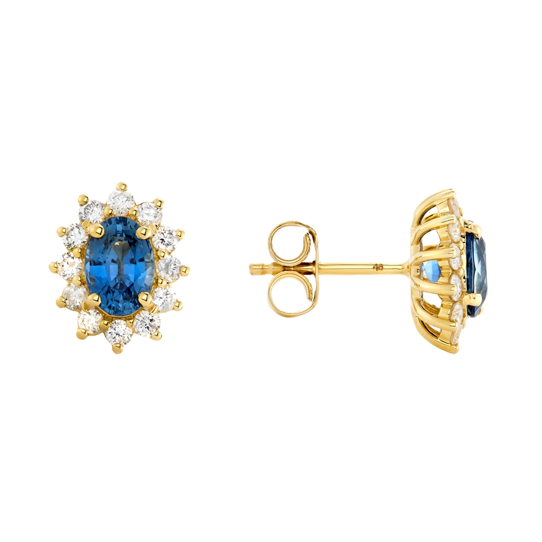 A brand-new, unused certified pair of natural diamond and blue sapphire gemstone cluster earrings, elegantly crafted in 18ct yellow gold. Each earring features an oval mixed-cut blue sapphire, together weighing 1.72 carats, displaying a rich violetish-blue hue that radiates depth and sophistication. Surrounding each sapphire is a refined cluster of brilliant-cut natural diamonds, totalling 0.50 carats, with G-H colour and SI1–SI2 clarity. The warm tone of the yellow gold setting enhances the vivid beauty of the sapphires while amplifying the diamonds’ crisp sparkle, creating a timeless design that exudes elegance and charm.