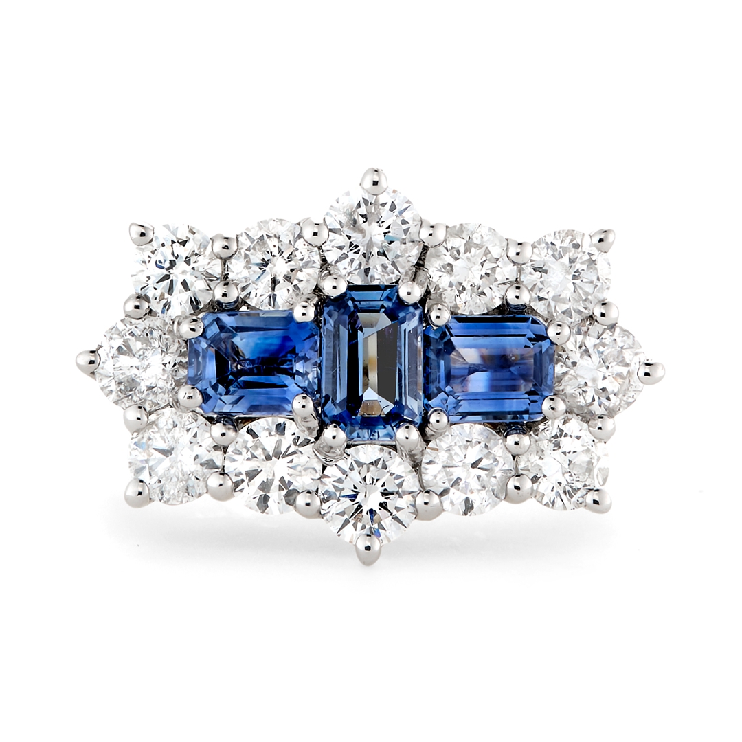 A brand-new, unused, certified 18ct yellow & white gold natural diamond & blue sapphire gemstone boat-shaped cluster ring, set with three octagonal step-cut blue sapphire gemstones at the centre & twelve brilliant-cut diamonds in a halo setting.