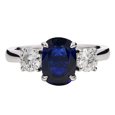 A brand-new, unused, certified natural diamond & blue sapphire gemstone cluster ring, set with one oval-cut blue sapphire gemstone at the centre & two brilliant-cut diamonds to the sides, set in platinum.