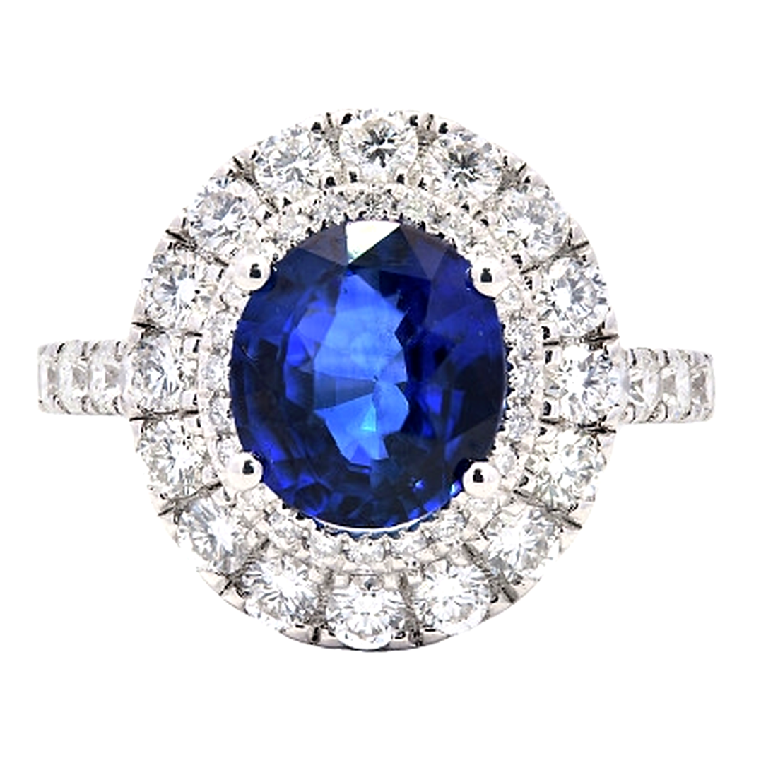 A brand-new, unused, certified natural diamond and blue sapphire oval-shaped cluster ring, centred with a magnificent 2.14ct oval-cut blue sapphire showcasing rich, velvety blue saturation and excellent natural clarity. The elongated oval cut enhances the gemstone’s depth of colour while creating an elegant, flattering presence on the hand. Framing the centre stone is a striking double halo of brilliant-cut natural diamonds that extends seamlessly to the shoulders, bringing the total diamond weight to an impressive 1.19ct and delivering exceptional sparkle from every angle.