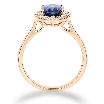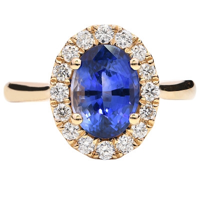 A brand-new, unused, certified natural diamond & blue sapphire gemstone oval-shaped cluster ring, set with one oval-cut blue sapphire gemstone at the centre & a cluster of brilliant-cut diamonds in a halo setting, set in 18ct yellow gold.